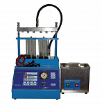Стенд для проведения проверки и промывки до 4 инжекторов в ультразвуковой ванне. Автоматический слив тестирующей жидкости. Работает от сжатого воздуха. Имитация работы форсунок происходит с помощью встроенного электронного блока управления форсунками. В комплект поставки входит ультразвуковая ванна объемом 2,0 литра с подогревом и мощностью генератора 60 ВТ.