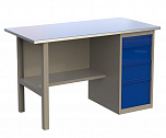 Верстак однотумбовый поставляется в разобранном виде. Нагрузка на столешницу до 600 кг. Стандартный цвет: корпус - серый глянец RAL 7030, ящики и двери тумб - синий RAL 5017. Размеры:855x1400x700 мм. Вес: 76 кг.
