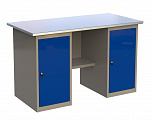 Верстак двухтумбовый поставляется в разобранном виде (4 элемента). Нагрузка на столешницу до 600 кг. Стандартный цвет: корпус - серый глянец RAL 7030, ящики и двери тумб - синий RAL 5017. Размеры: 855x1400x700 мм. Масса: 78 кг.