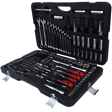 Набор инструментов в чемодане 1/4" & 1/2" 12-гранный 85 предметов. В наборе: Головки торцевые 1/2" и 1/4" 12 граней, головки с насадкой HEX и TORX 1/4", головки с шлицевой насадкой 1/4", головки с насадкой PH 1/4", свечные головки 1/2", (насадки 5/16" HEX,TORX,PH,PZ), держатель бит 1/2х5/16", трещотка 1/4", удлинители 1/2" и 1/4", кардан 1/2" и 1/4", вороток-отвертка 1/4", вороток 1/4" с плавающей головкой, гибкий вал 1/4", трещотка 1/2" 72 зубца, переходник 3/8х1/2" с отверстием, ключи рожково-накидные 8-19 мм.