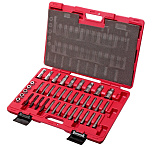 Набор головок торцевых и вставок 1/4&1/2 6-ти гранных в чемодане 110 предметов. В наборе: головки торцевые 1/4", головки торцевые длинные 1/4", головки торцевые 1/4", головки с насадкой HEX 1/4", головки с насадкой TORX 1/4", головки с шлицевой насадкой 1/4", головки с насадкой PH 1/4", насадки PZ 1/4", трещотка силовая 36 зубцов, удлинитель 50 и 100 мм, удлинитель гибкий, вороток с плавающей головкой, кардан, вороток-отвертка, короткие шестигранники, головки торцевые 1/2", головки торцевые длинные 1/2", головки торцевые 1/2", насадки 5/16 HEX 1/2", насадки 5/16 TORX 1/2", насадки 5/16'‘ PH для ударной отвертки 1/2", насадки 5/16» PZ для ударной отвертки: PZ, насадка 5/16'‘, трещотка силовая 36 зубцов резиновая ручка, удлинитель: 125 и 250 мм, кардан, головка свечная, переходник 3/8х1/2 с отверстием, держатель бит: 3/8х5/16.
