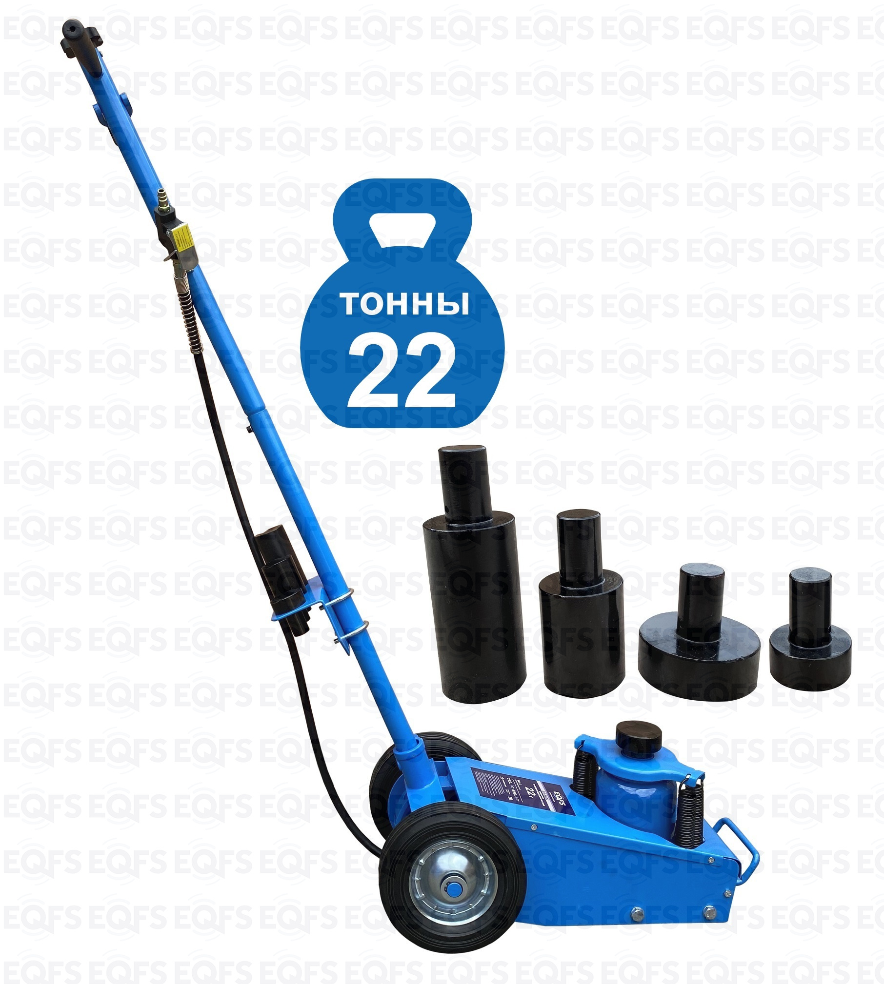 Пневмогидравлический домкрат Г/П - 22 т. Мобильный. Закаленный шток цилиндра обеспечивает надежность работы. 4 возвратные пружины для быстрого опускания домкрата. Разъем для подключения пневмосети. Клапан для быстрого опускания домкрата. Фиксатор угла наклона рукоятки. Угол наклона рукоятки 0-90грд. Удобная ручка для переноски домкрата. В комплекте 4 удлиняющих адаптера: 25 мм, 25 мм, 60 мм, 100 мм. Высота подхвата: 215-456 мм с адаптером 556 мм.