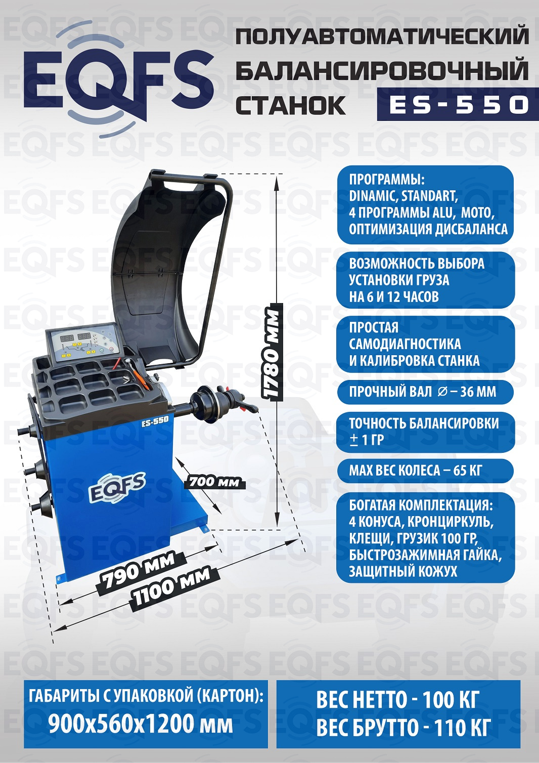 ES-550 Балансировочный станок. Полуавтомат. Удобный и понятный интерфейс. Автозапуск опусканием кожуха. Автоматический ввод дистанции и диаметра диска. Лазерная навигация. Автокалибровка. Для колес легковых автомобилей, мотоциклов, «Газелей», «Спринтеров» с диаметром диска с резиной до 800 мм. Размеры диска: ширина 3–10” (76-254 мм) , диаметр диска 10–24” (254÷609 мм). Вес ≤ 65 кг. Вал- 36 мм. Точность ±1гр. 220 В. Режимы работы DINAMIC, STATIC, ALU1, ALU2, ALU3, ALUS, ST. Гарантия 12 мес. В комплекте: кожух с автозапуском + клещи + кронциркуль + быстрозажимная гайка + набор конусов.