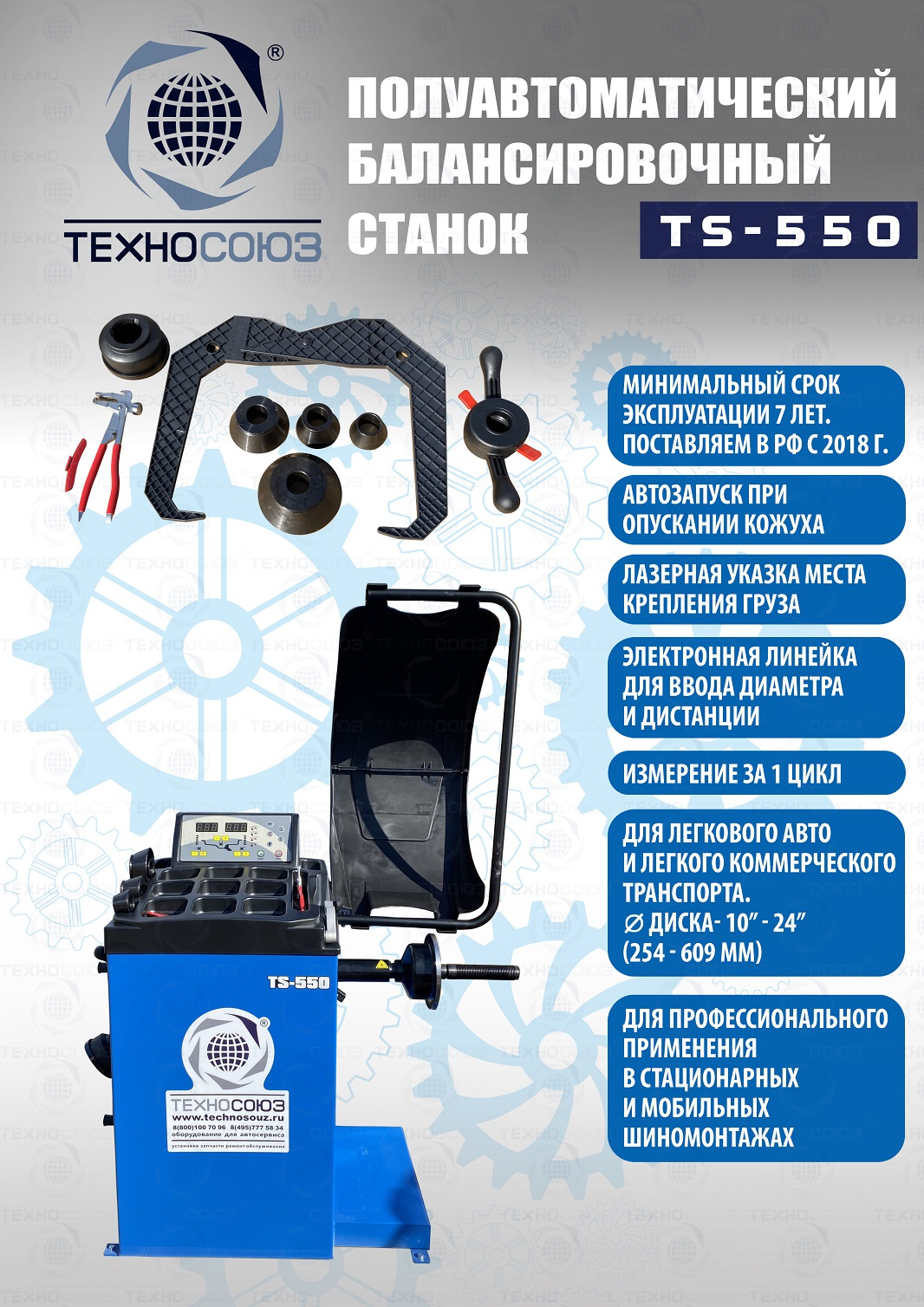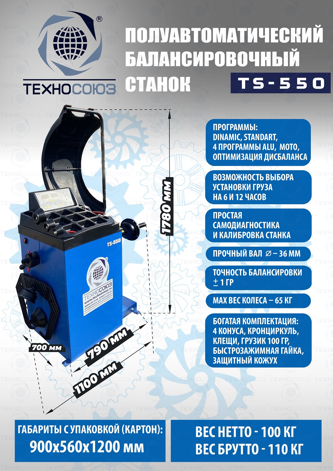 TS-550 Балансировочный станок (с лазером) Автоматический ввод дистанции и диаметра диска.  Полуавтомат. Автозапуск опусканием кожуха. Станок для колес легковых автомобилей, мотоциклов, «Газелей», «Спринтеров» и т.п. с диаметром диска с резиной до 800 мм. Размеры диска: ширина 3–10” (76-254 мм) , диаметр диска 10–24” (254÷609 мм). Вес ≤ 65 кг. Вал- 36 мм.Точность ±1гр. 220 В. Режимы работы DINAMIC, STATIC, ALU1, ALU2, ALU3,  ALUS, ST. Автокалибровка. Гарантия 12 мес. В комплекте: кожух с автозапуском + клещи + кронциркуль + быстрозажимная гайка + набор конусов.