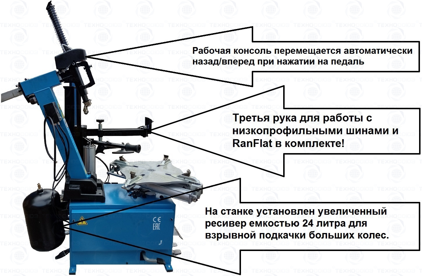 Автоматического шиномонтажного станка TS-3226А. Для дисков: 11÷24”. В комплекте: полноценная 3-й рука для работы с жесткой и низкопрофильной резиной RUNFLAT. + встроенный бустер 24 литра (взрывная подкачка) + пистолет для подкачки шин + монтажка + регулятор давления с влагоотделителем и манометром.