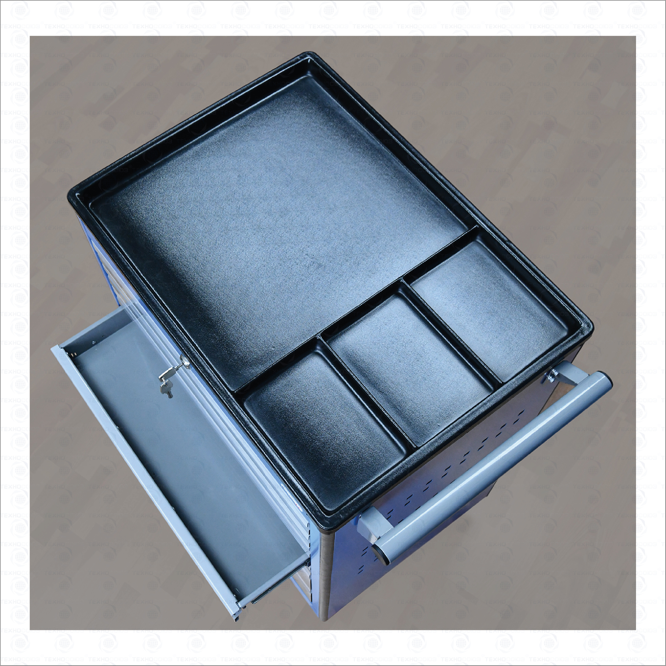Тележка снабжена центральным замком с поворотом ригеля 180 градусов, который закрывает одновременно все ящики. Замок неподвижно и прочно закреплен на корпусе тележки. В комплекте имеется два ключа. Тяга замка подпружинена.