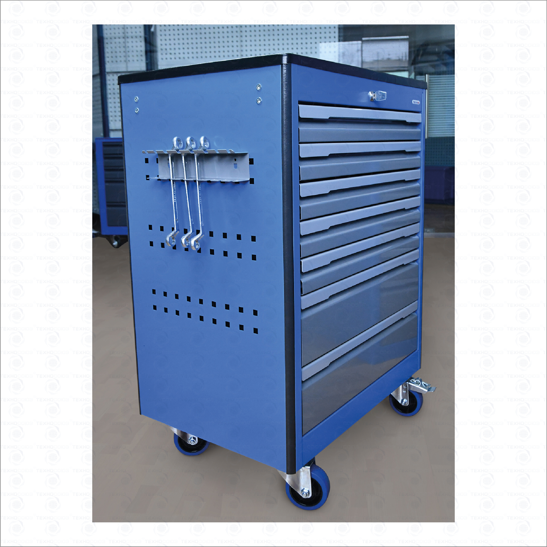 Ящики устанавливаются на шариковых телескопических направляющих полного выдвижения. Обеспечен свободный и плавный ход ящиков даже при полной загрузке. На лицевой панели каждого ящика установлена ручка-накладка. Каждый ящик снабжен клавишной системой антиоткрывания из оцинкованной стали, препятствующей самопроизвольному выдвижению ящиков, например, при наклоне или перемещении тележки.