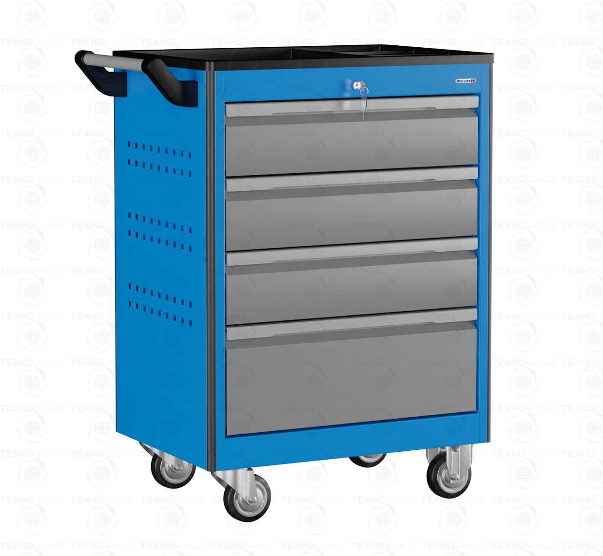 Тележка с 4 выдвижными ящиками предназначена для хранения и транспортировки к рабочему месту инструментов, приборов и другой оснастки, необходимых для работы на сервисных и слесарных участках, а также в цехах заводов и на промышленных предприятиях.Корпус тележки сварной. На боковых стенках корпуса выполнена квадратная перфорация 12х12 мм с шагом 38 мм для установки крючков, держателей и других аксессуаров.
