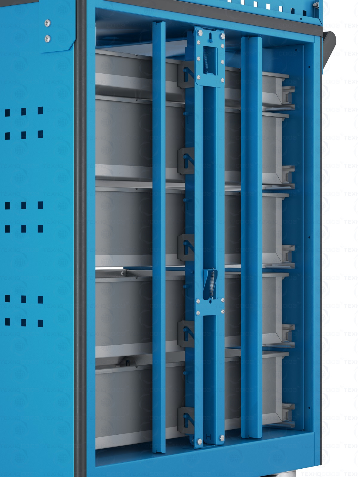 Перфоэкран предназначен для размещения навесных элементов.  Корпус тележки сварной. На боковых стенках корпуса выполнена квадратная перфорация 12х12 мм с шагом 38 мм для установки крючков, держателей и других аксессуаров.  Ящики устанавливаются на шариковых телескопических направляющих полного выдвижения. Обеспечен свободный и плавный ход ящиков даже при полной загрузке. На лицевой панели каждого ящика установлена ручка-накладка. Каждый ящик снабжен клавишной системой антиоткрывания из оцинкованной стали, препятствующей самопроизвольному выдвижению ящиков, например, при наклоне или перемещении тележки.  Тележка оснащена системой антиопрокидывания новой конструкции, которая блокирует открывание ящиков, если один из них уже выдвинут. Это препятствует смещению центра тяжести и предотвращает опрокидывание тележки.  На углах тележки установлены специальные резиновые защитные бамперы.  Тележка оснащена четырьмя колесными опорами с диаметром колеса 100 мм. Две поворотные колесные опоры с тормозом и две поворотные колесные опоры без тормоза.