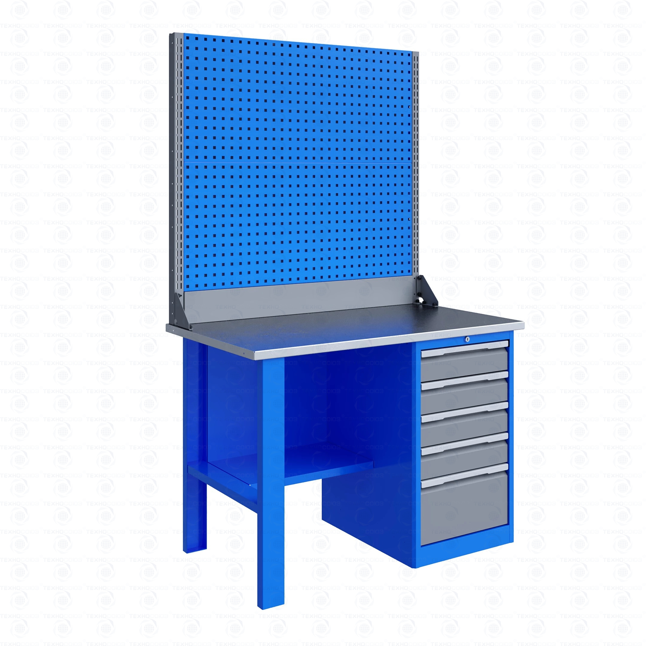 Однотумбовый. Допустимая нагрузка на столешницу 750 кг. Опорные элементы выполнены сварными из холоднокатаной стали. Верстак состоит из столешницы, опоры, тумбы P5 с четырьмя малыми и одним большим ящиком, полки-стенки, двойного экрана с кронштейнами. Все металлические элементы покрыты полиэфирной порошковой краской. Столешница из фанеры марки ФСФ толщиной 24 мм, которая покрыта лаком-антисептиком и листом оцинкованной холоднокатаной стали толщиной 1,2 мм. Размеры (ВхШхГ) 1965x1196x696 мм.