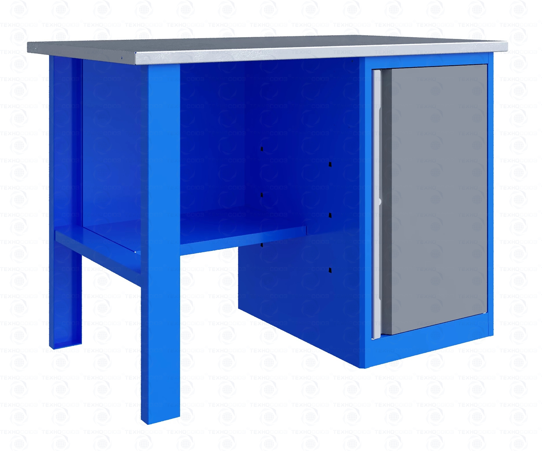 Верстак комплектуется полкой-стенкой, расположенной под столешницей для удобного размещения габаритного инструмента и оснастки.